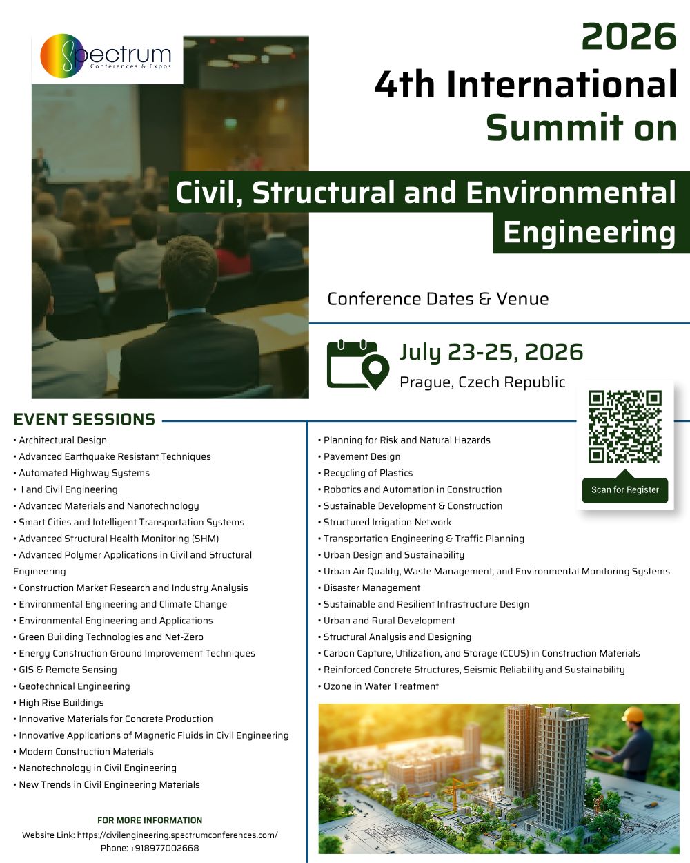 Spectrum Conferences cordially invites you to its 4th International Summit on Civil, Structural and Environmental Engineering (ISCSEE2026), which is going to be held in Prague, Czech Republic during July 23-25, 2026.