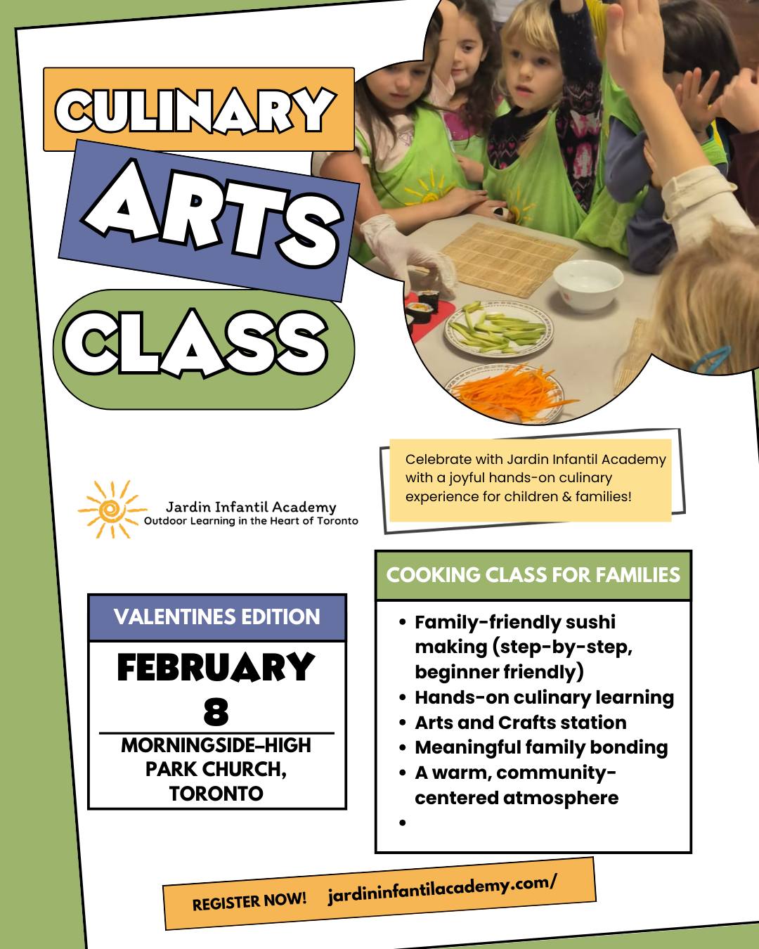 This is a community collaboration with Morningside–High Park Church. Join Jardin Infantil Academy for a special Culinary Arts Trial Class – Valentine’s Edition, where children and families cook together, create together, and enjoy meaningful time in a welcoming community space. 📍 Morningside–High Park Church, Toronto 📅 Sunday, February 8 ⏰ 3:00–5:00 PM ✨ What’s included: Beginner-friendly sushi making Hands-on culinary learning Arts & crafts station Family bonding & community connection Suggested donation: $25 per person Registration: https://jardininfantilacademy.com/celebrate-valentines-day-with-a-hands-on-culinary-experience-%F0%9F%92%95/ All ages & skill levels welcome