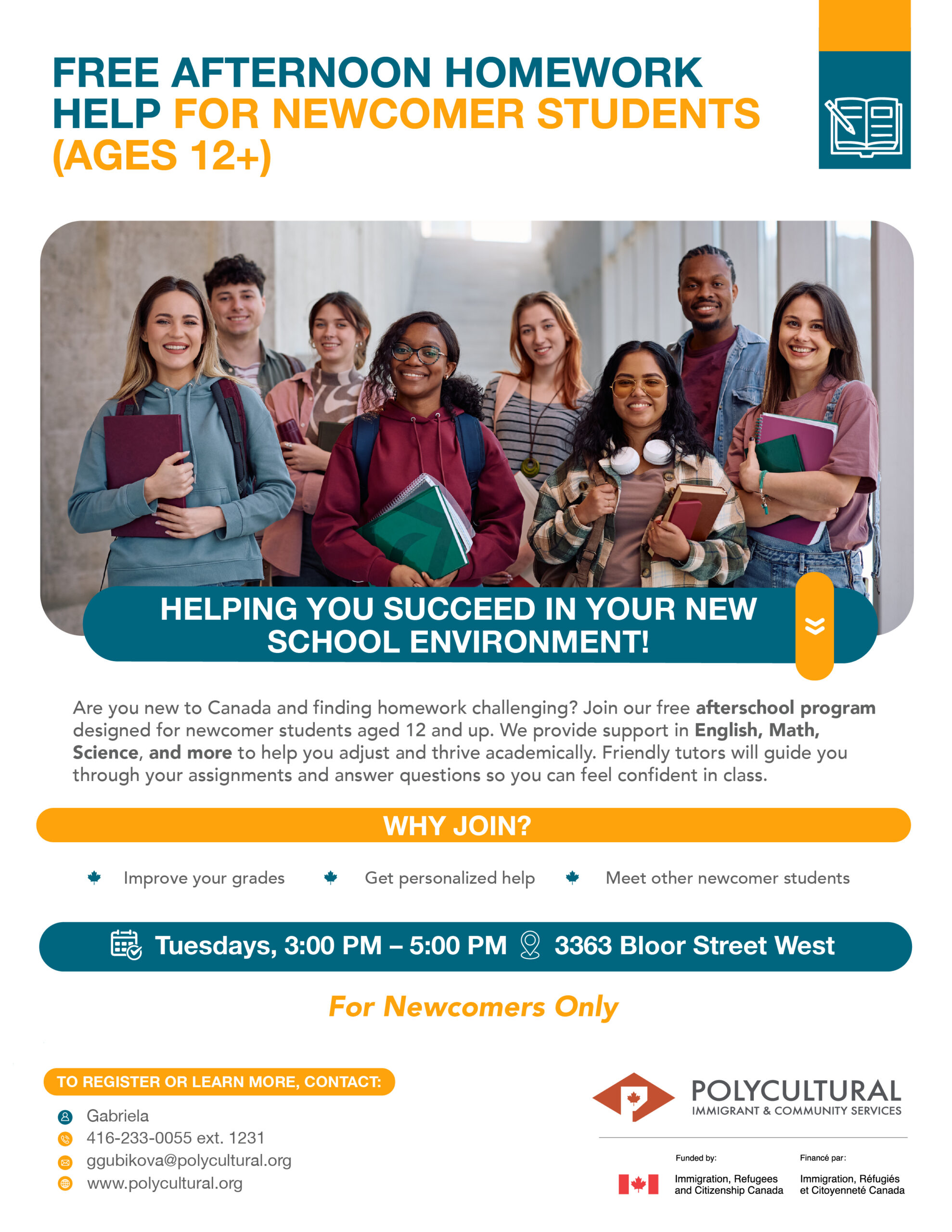 We at Polycultural Immigrant & Community Services are excited to invite newcomer students aged 12 and up to join our free afterschool homework help program!