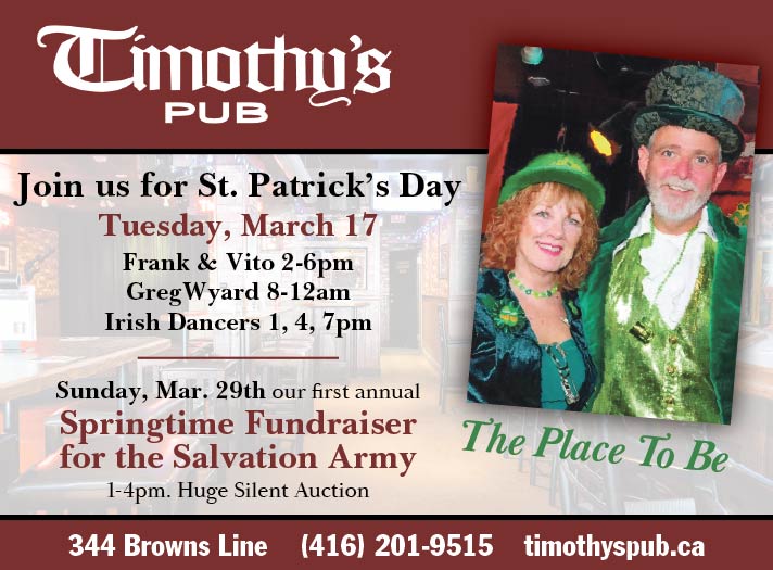 Join us for our annual St. Patrick’s Day bash featuring Frank & Vito from 2-6pm, Greg Wyard from 8pm to midnight and Irish Dancers at 1pm, 4pm and 7pm.