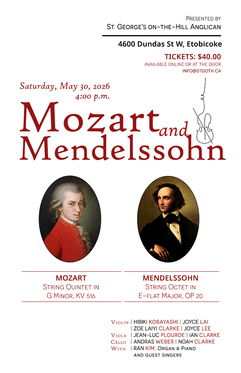 String quintet in G Minor KV 516 and String Octet in E-Flat Major, OP 20 with violins, violas , cellos, Ran Kim on organ and piano and guest singers.