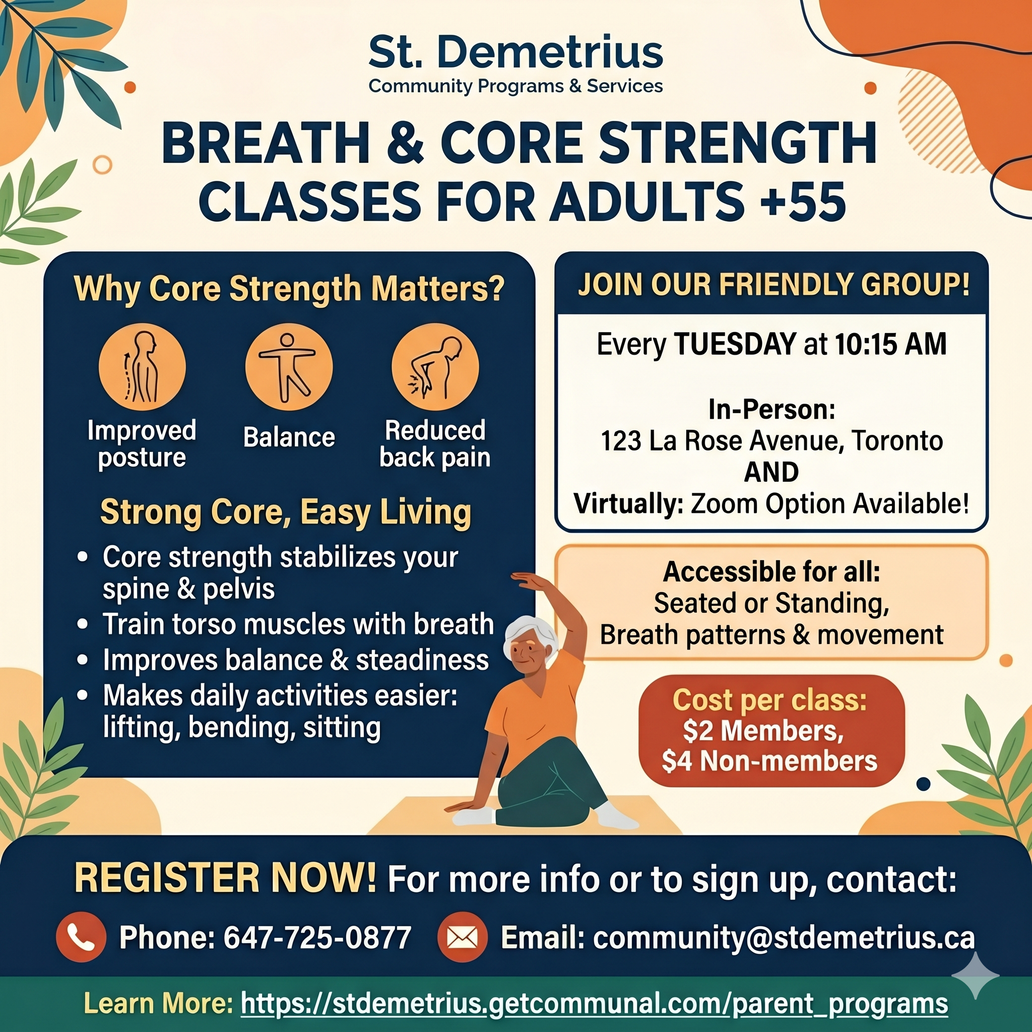Come join new friends in the Stay Connected Program in our weekly exercises classes! The program is offered to older adults 55+ and is held in person at 123 La Rose Avenue, or virtually via Zoom. Learn More: www.stdemetrius.ca/community-programs — Core strength is the ability of the muscles in your trunk—including your abdomen, back, and […]