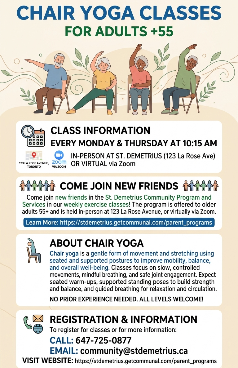 Come join new friends in the St. Demetrius Community Programs and Services in our weekly exercises classes! The program is offered to older adults 55+ and is held in person at 123 La Rose Avenue, or virtually via Zoom. Learn More: www.stdemetrius.ca/community-programs — Chair yoga is a gentle form of movement and stretching that uses […]