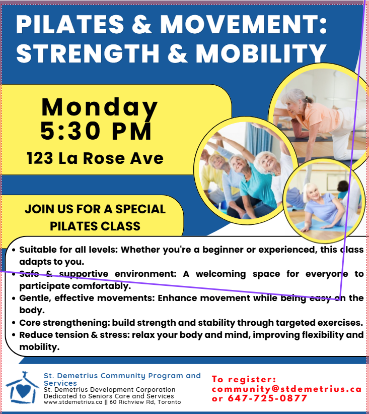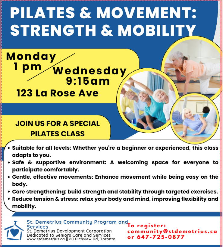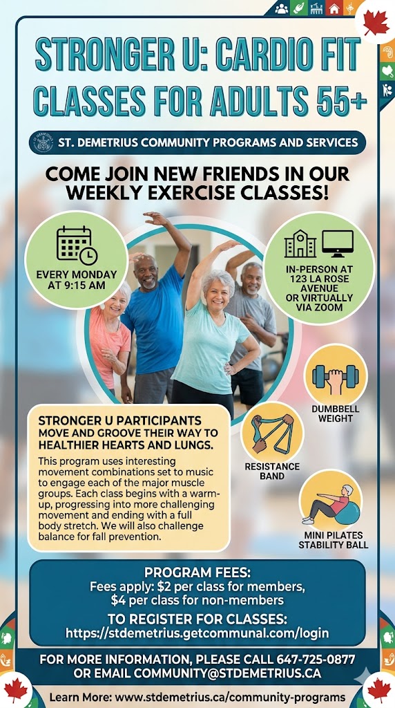 Come join new friends in the Stay Connected Program in our weekly exercises classes! The program is offered to older adults 55+ and is held in person at 123 La Rose Avenue, or virtually via Zoom. Learn More: www.stdemetrius.ca/community-programs — Suitable for all levels: Whether you’re a beginner or experienced, this class adapts to you. […]