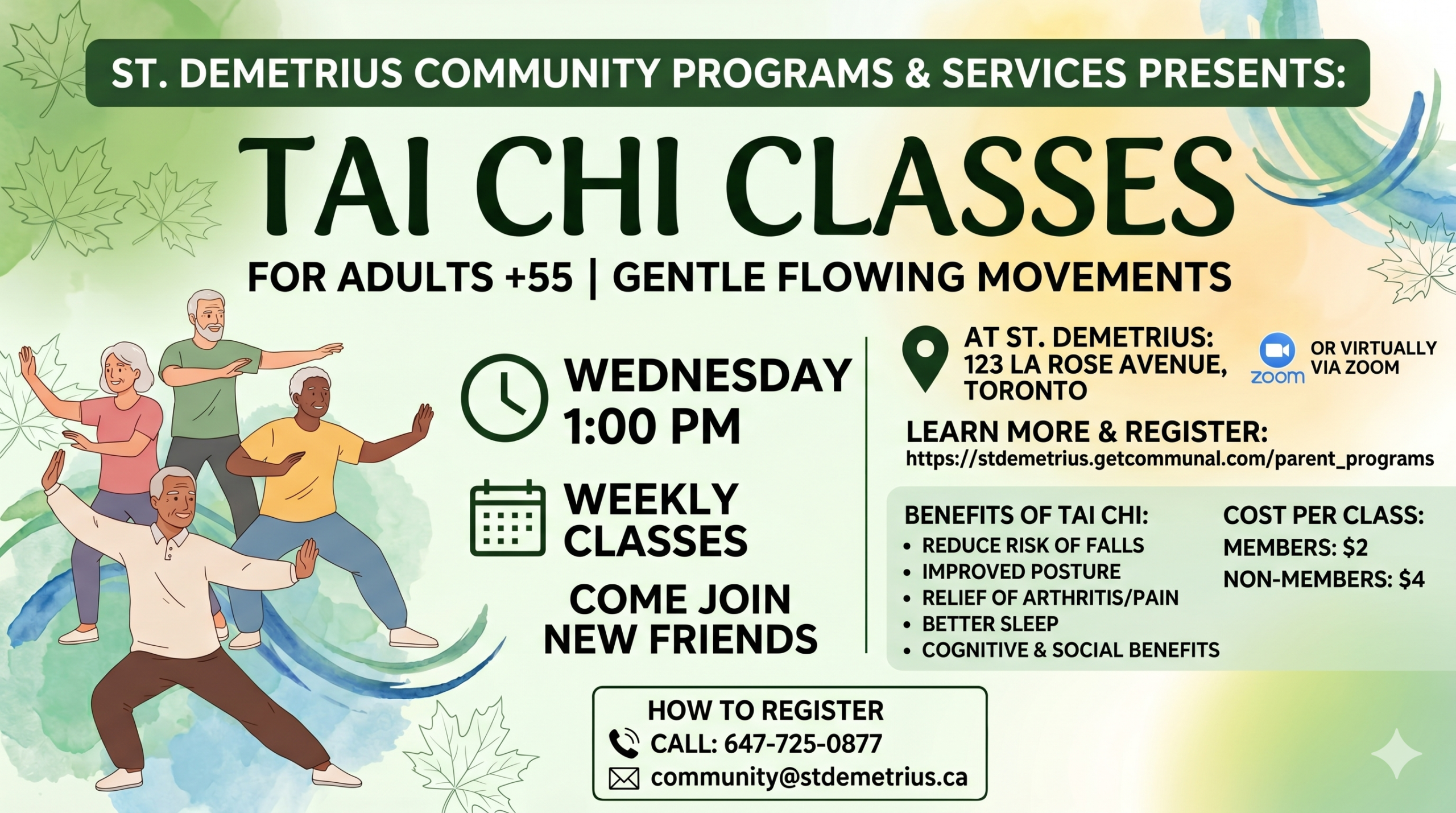 Come join new friends in the St. Demetrius Community Programs and Services in our weekly exercises classes! The program is offered to older adults 55+ and is held in person at 123 La Rose Avenue, or virtually via Zoom. Learn More: https://stdemetrius.getcommunal.com/parent_programs — Tai Chi's gentle flowing movements using all the muscles and joints of […]