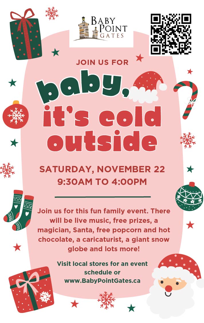 Join us for this fun family event. There will be live music, free prizes, a magician, Santa, free popcorn and hot chocolate, a caricaturist, a giant snow globe and lots more! Visit local stores for an event schedule or www.BabyPointGates.ca