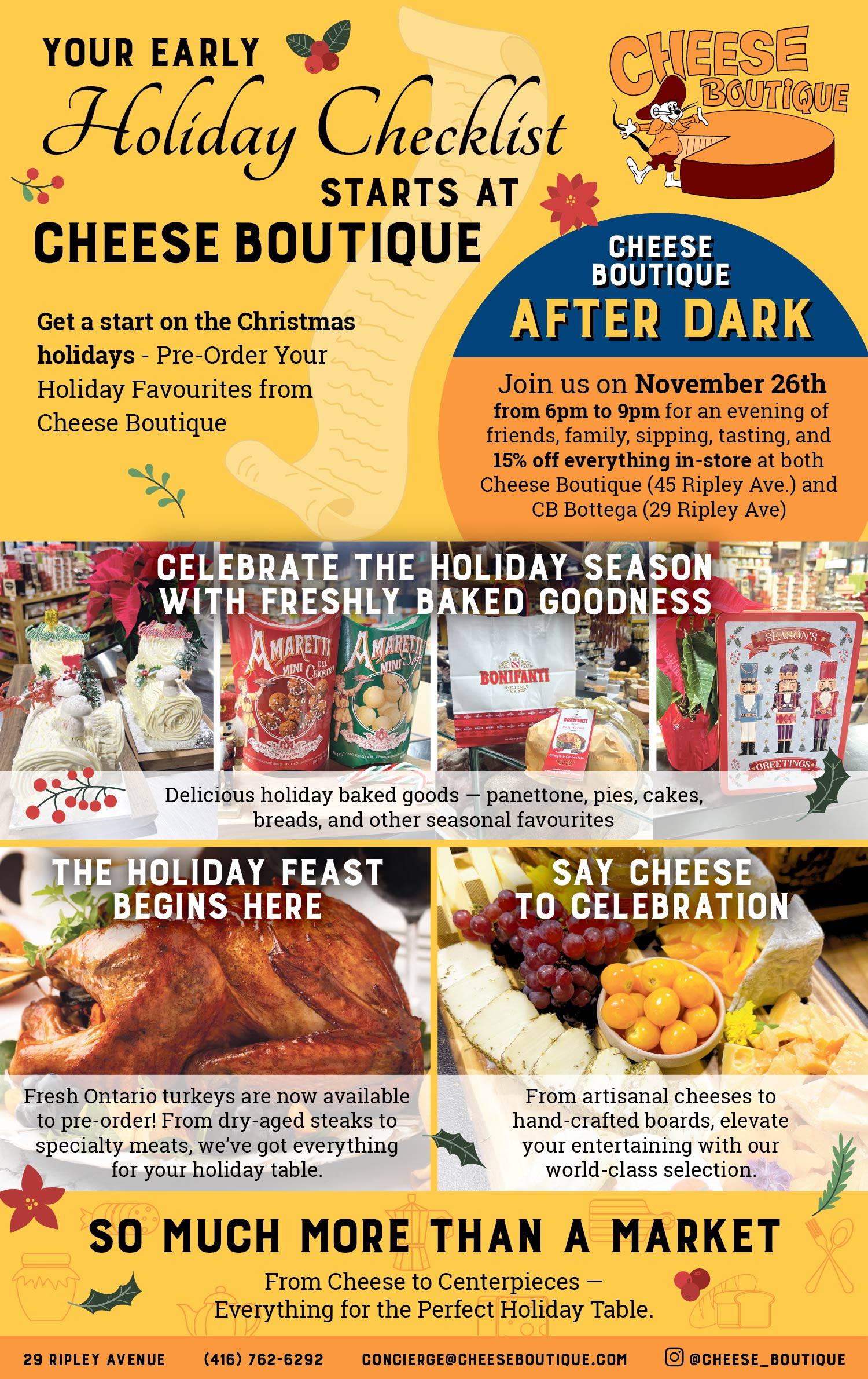 Join us on November 26th from 6pm to 9pm for an evening of friends, family, sipping, tasting, and 15% off everything in-store at both Cheese Boutique (45 Ripley Ave.) and CB Bottega (29 Ripley Ave.).