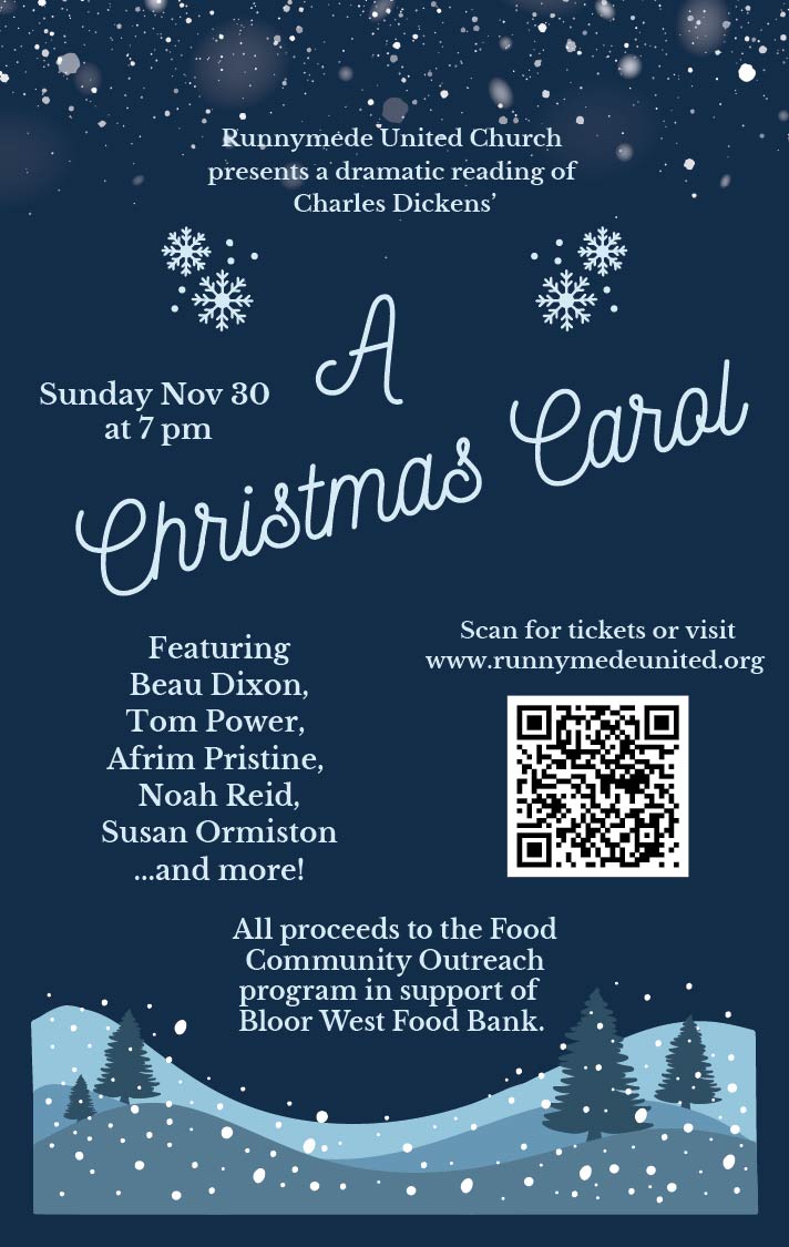 Runnymede United Church presents a dramatic reading of Charles Dickens' FeaturingBeau Dixon, Tom Power, Afrim Pristine, Noah Reid,Susan Ormiston and more! Scan for tickets or visit www.runnymedeunited.org All proceeds to the Food Community Outreach program in support of Bloor West Food Bank.