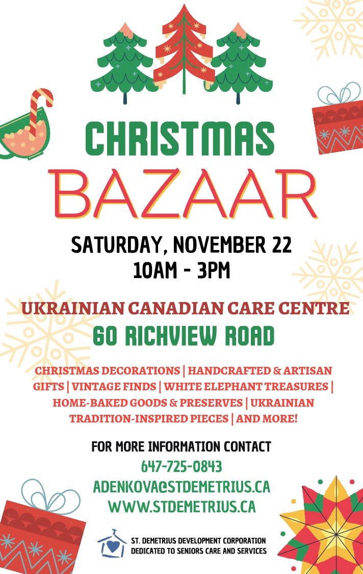 CHRISTMAS DECORATIONS | HANDCRAFTED & ARTISAN GIFTS | VINTAGE FINDS | WHITE ELEPHANT TREASURES HOME-BAKED GOODS & PRESERVES | UKRAINIAN TRADITION-INSPIRED PIECES | AND MORE! FOR MORE INFORMATION CONTACT 647-725-0843 ADENKOVA@STDEMETRIUS.CA WWW.STDEMETRIUS.CA