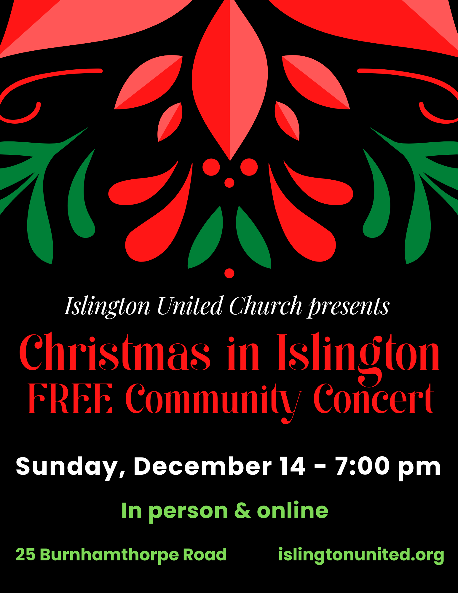 Islington United Church 25 Burnhamthorpe Road, TorontoJoin us in person or online for a spectacular Christmas concert being held on Sunday, December 14 at 7:00pm! Christmas in Islington is a longstanding tradition in Islington Village. An evening of choral and orchestral music, you will not want to miss this performance as part of your Christmas festivities. Doors open at 6:30pm. We […]